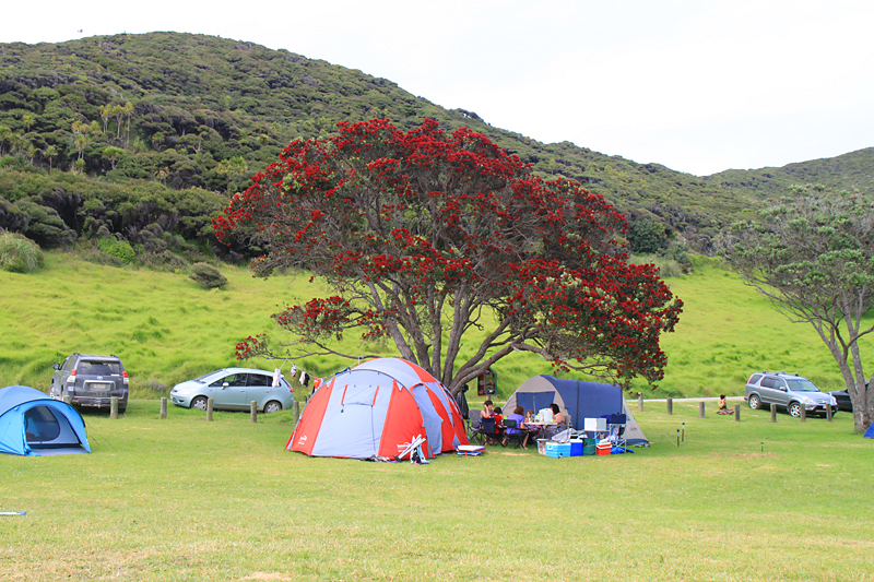 Семейство поставило палатку под цветущей похутукавой.