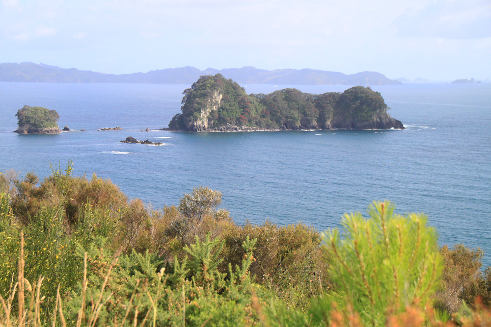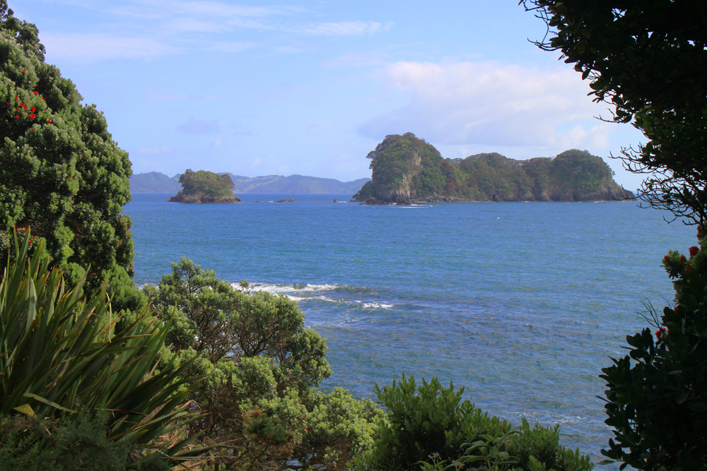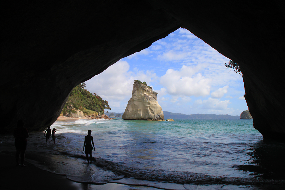 В нескольких километрах от пляжа есть очень красивое место: прогулочная тропа вдоль берега, выходящая на пляж со скальной аркой. Арки такой формы везде называют одинаково — Cathedral, поэтому и бухта со скалой называется Cathedral cove. Мы туда изначально не собирались, просто не знали про бухту. Однако в кемпинге висели такие красивые фотографии, что невозможно было не пойти.