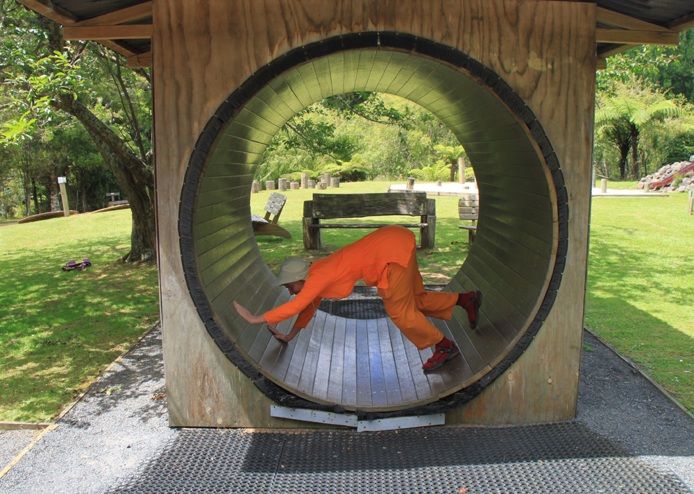 Неподалеку от пляжа с горячей водой есть забавный парк Waterworks со всякими смешными и занятными инсталляциями. Он не похож на музей, потому что все интерактивное. Не похож и на парк аттракционов, потому что адреналин тут ни при чем. Можно и нужно везде залезать, всё дергать за веревочку, кататься на всем доступном и всячески участвовать. Честно говоря, поначалу я стеснялась, очень непривычно. Потом разошлась.