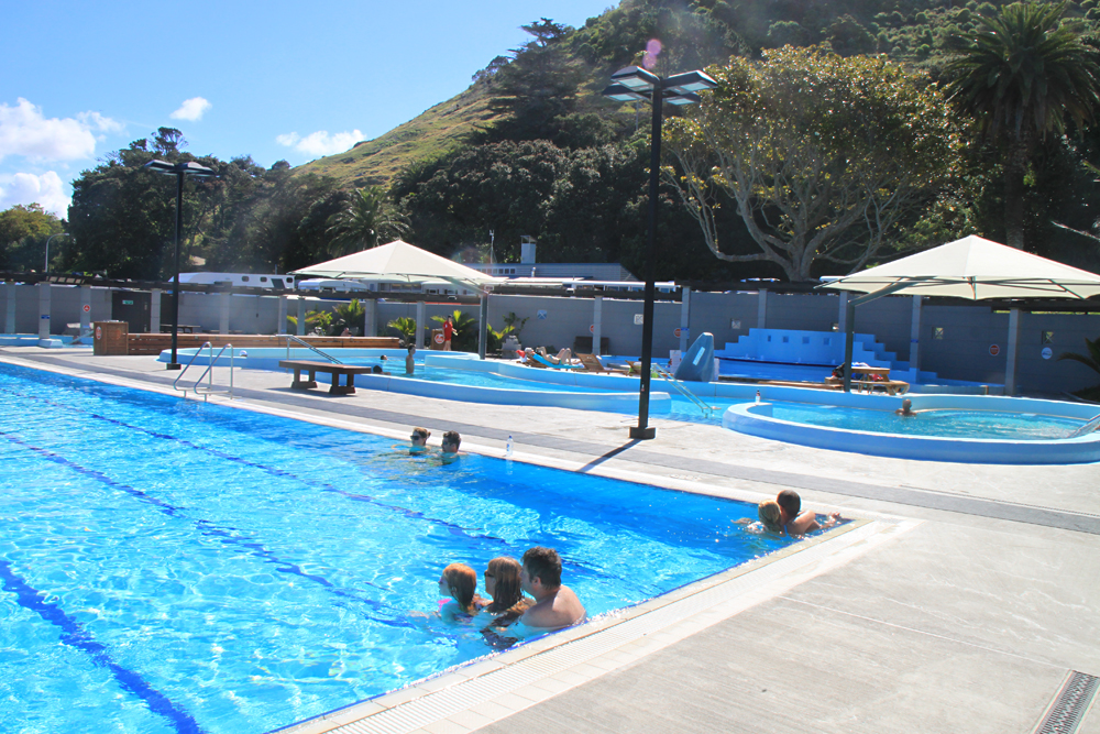Цена за вход 10.80 NZD с человека, а если надо запирающийся ящик для ценных вещей, то еще 2 доллара. Есть три бассейна — один для активного плавания (около +34), другой «пассивный» +37–38, с гидромассажем, еще один детский. Отличное место, бассейны большие и просторные. Есть навесы от солнца.