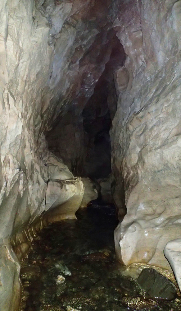 Вода промыла узкий и высокий проход, стены причудливо изогнуты.