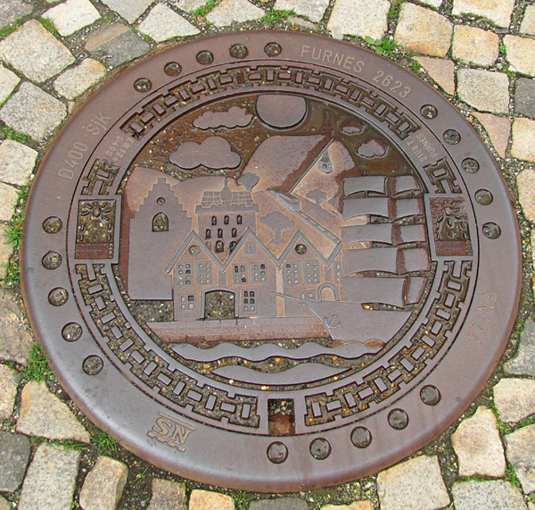 На брусчатой мостовой Бергена красуются вот такие фигурные люки. Тут и башня, и ряд домиков Бригген - всё что нужно изображено :-)