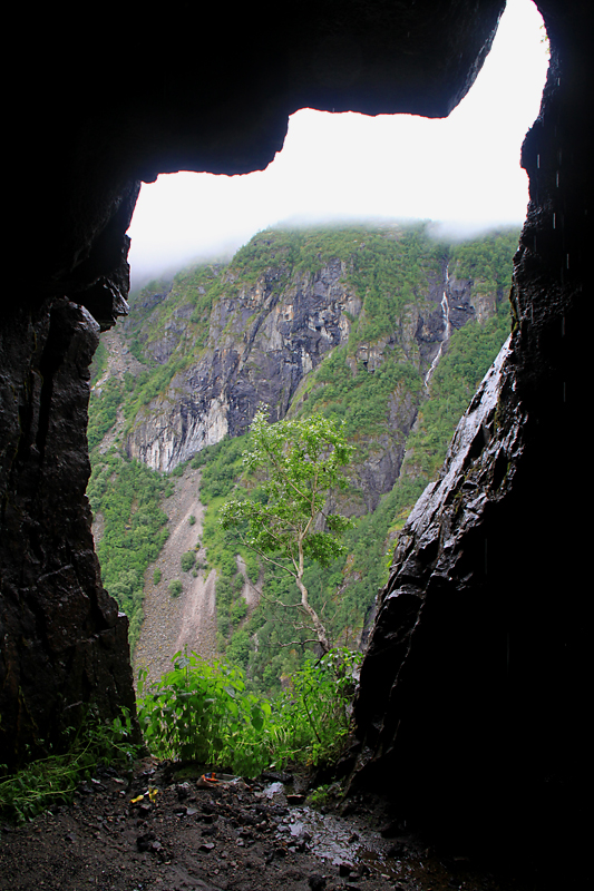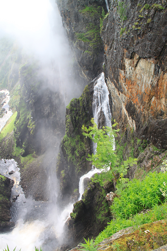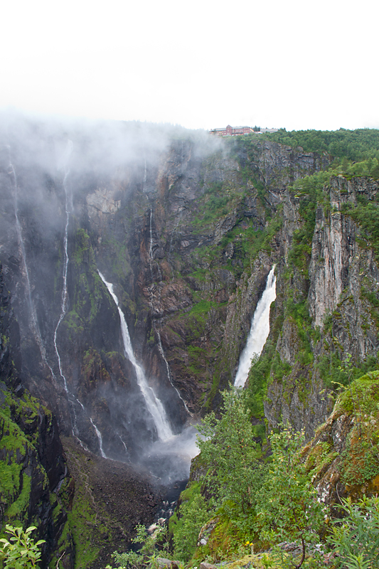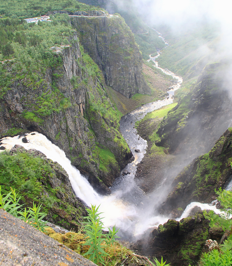 А потом мы приехали к водопаду Вёрингсфоссен. Все туристы покорно подошли к ограждению, послушали, как шумит 300-метровый водопад, и грустно побрели в автобус. Туман был такой, что за 20 метров ничего было не видно, только слышно.