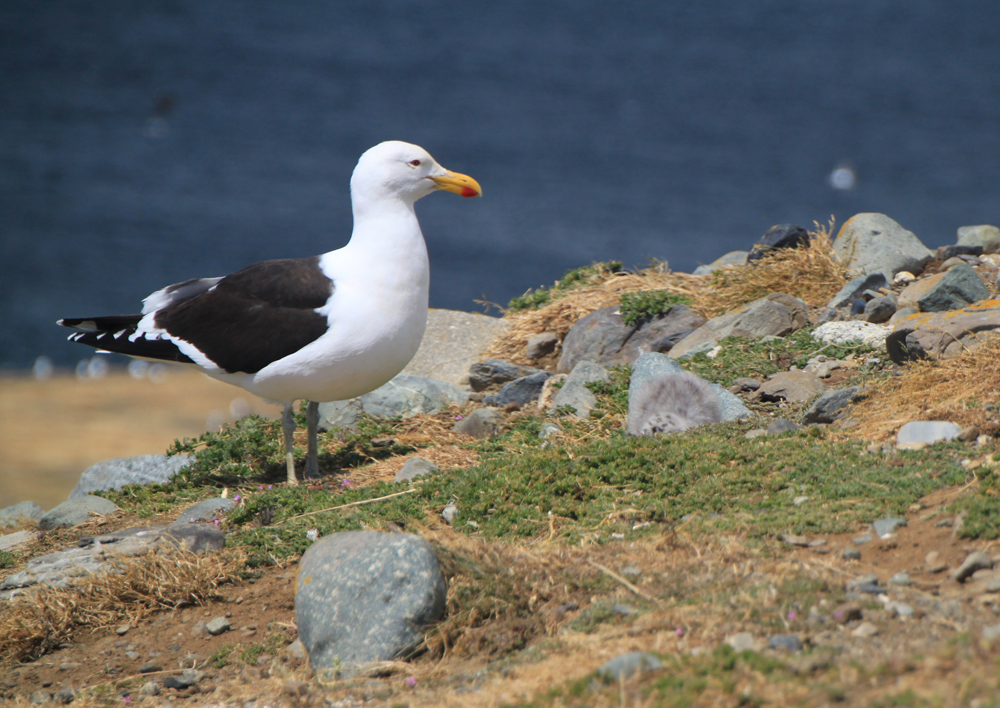 На острове живут не только пингвины, но и чайки, у них тоже летом вылупляются смешные серые птенцы в крапинку.