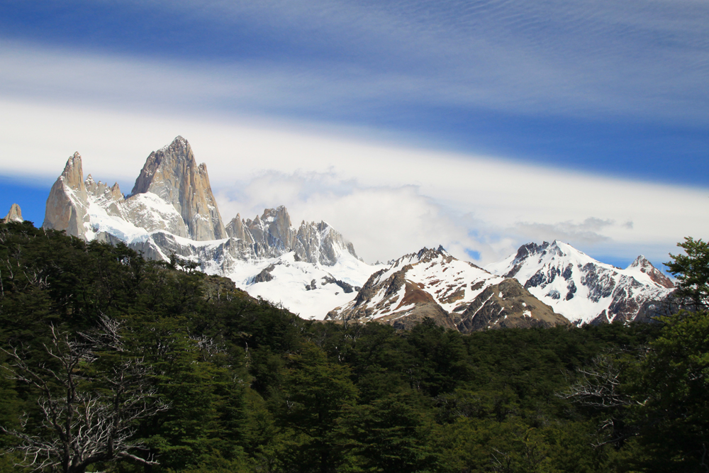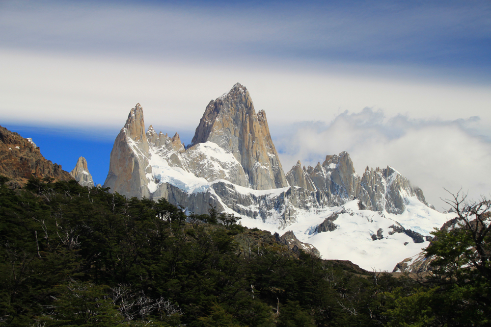Вскоре за верхушками деревьев стал проглядывать Фиц Рой.