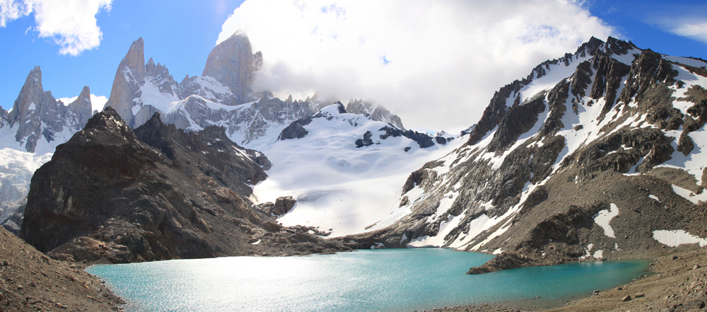 Все остальные пошли наверх к верхним озерам. Вместо заявленных двух километров от кемпинга там по gps почти три с половиной, последний участок весьма крутой — 500 м подъема. Так что эта часть примерно равна по сложности всему длинному, но простому подходу. Зато мы шли налегке. Фиц Рой то закрывался облаками, то открывался. Наверху мы подождали немного и все-таки поймали момент, когда облака разошлись.