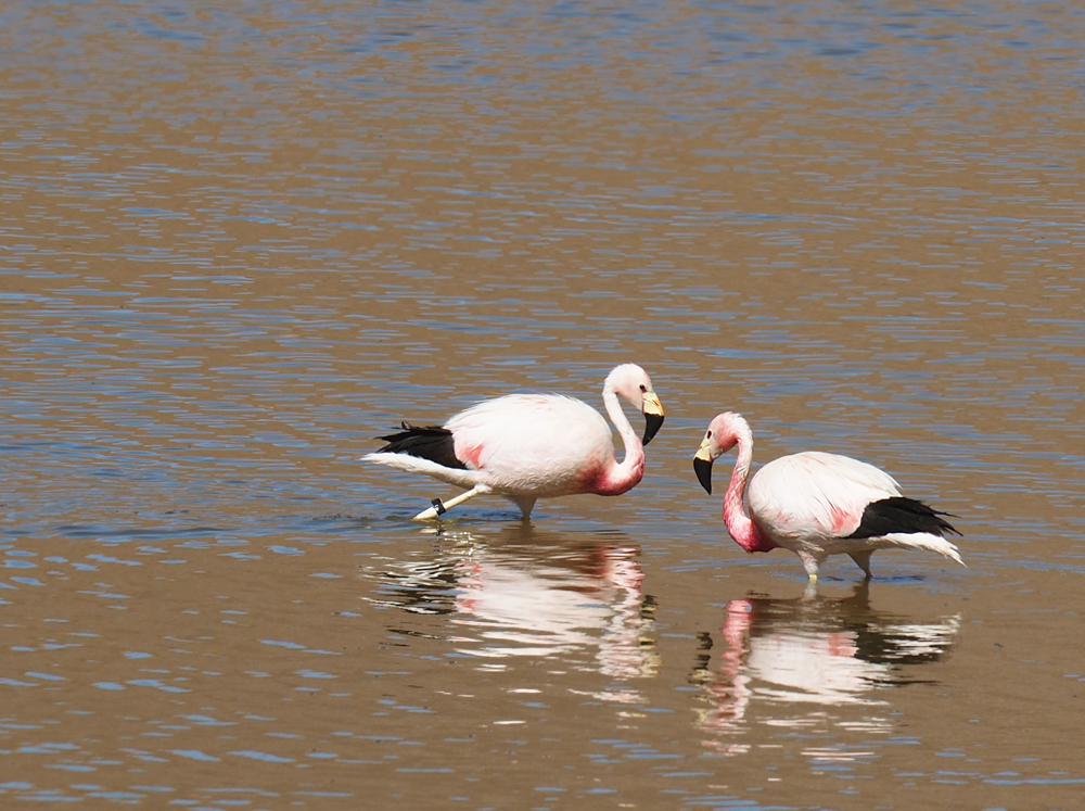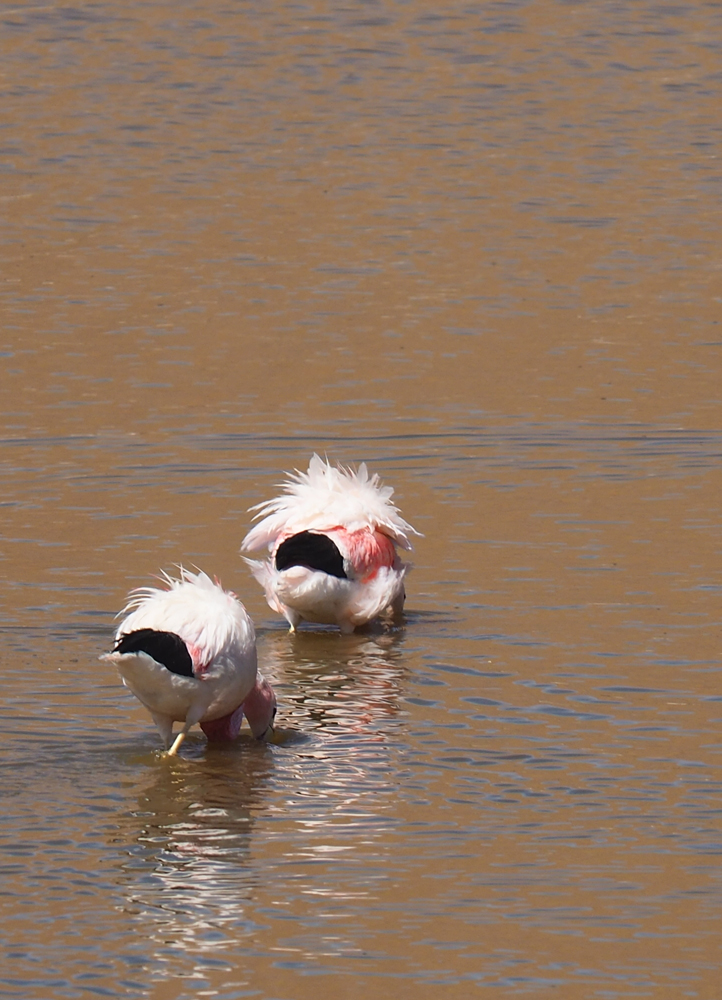 Всех туристов везут к гейзерам затемно, рано утром, чтобы встречать возле них рассвет. Мы же ехали днем и у нас была возможность полюбоваться лагунами. В лагунах кормятся фламинго.