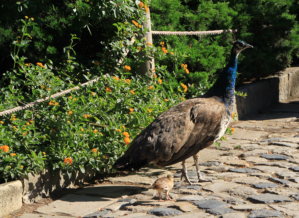 А еще в замке гуляет целая стая павлинов с цыплятами.