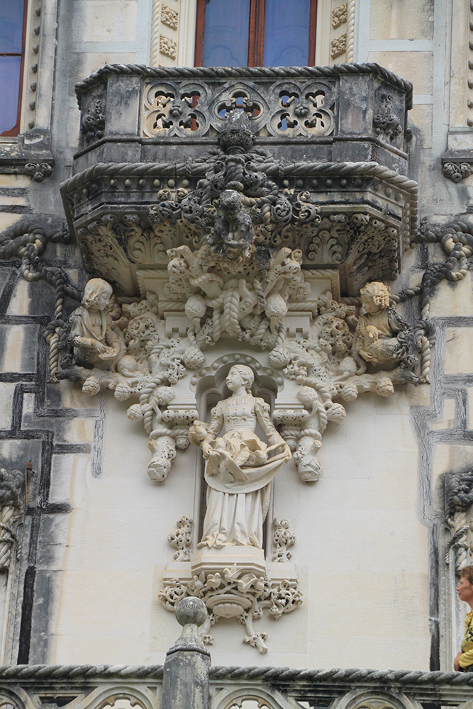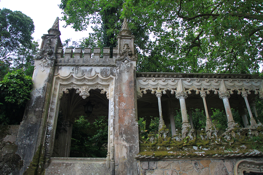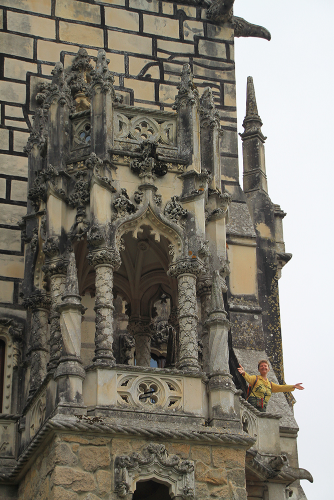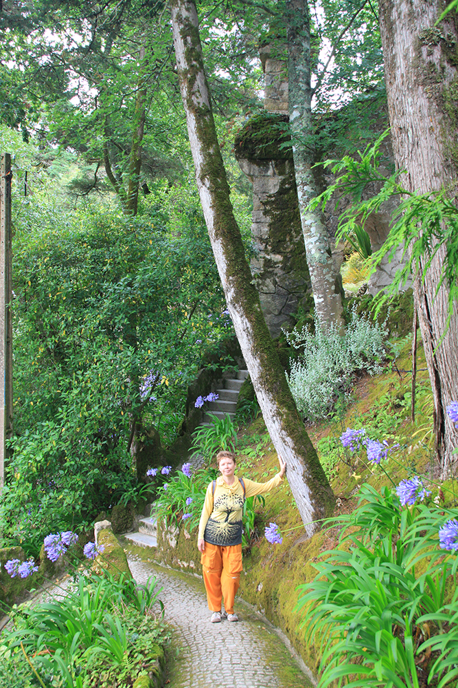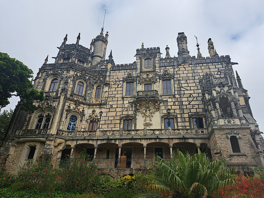 Мы сперва надеялись на прояснение, поэтому во дворец Пена сразу не пошли, а отправились в Кинта да Регалейра. Вход стоит 12 евро с человека, скидка по Лиссабонской карте 20 процентов. Облачность не мешает осматривать здешний дворец и парк, даже добавляет колорита.