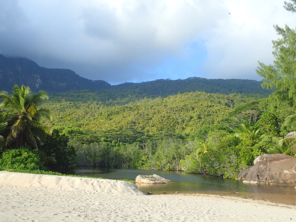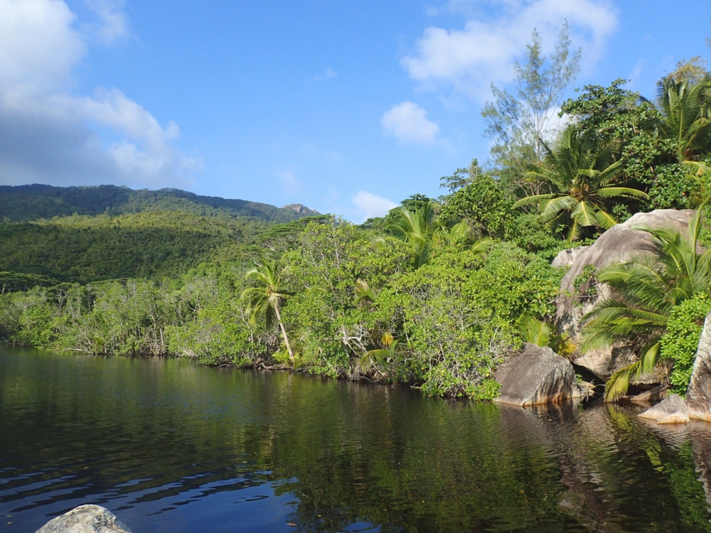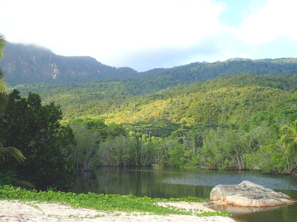 Сразу за пляжем начиналась пресная лагуна с красивым лесом вокруг.