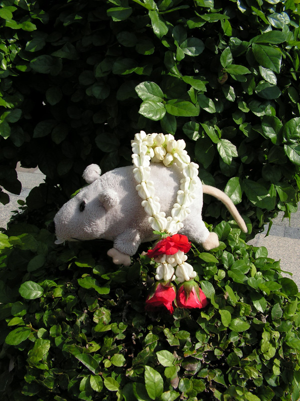 Мышка несет подношение в храм. Гирлянда сделана из вкусно пахнущих цветов.