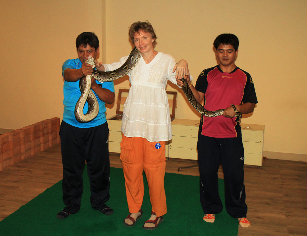 С питоном мы уже во Вьетнаме обнимались, но там его свободно вешали на шею и отпускали. А тут обниматься можно было только под строгим надзором и с удушающим захватом.
