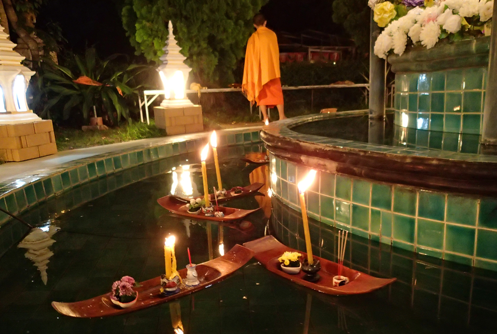Возле них запускают небесные фонарики и кратонги. Вообще-то кратонг — это лодочка из листьев, со свечками и благовониями, которая пускается по реке. Но тут в храме был специальный фонтанчик с круговым течением, а лодочки предлагали пускать деревянные.