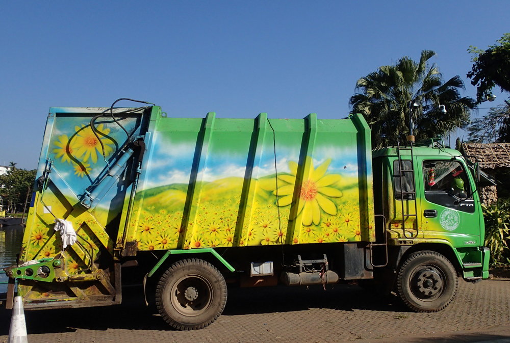 А это веселая и позитивная машина-помойка. Мы уже знаем, почему на ней такие цветочки, видели их по дороге к Мэ Сурин.