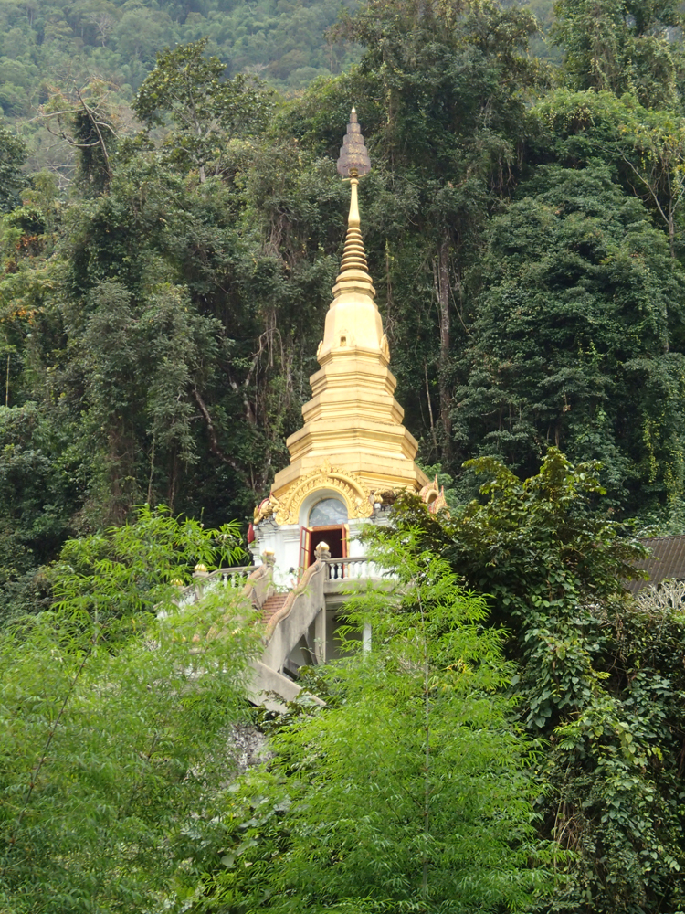 Вернувшись к машине, мы проехали пару километров до храма Tham Pha Plong. В каком-то смысле это тоже пещерный храм (tham — пещера по-тайски), а еще монастырь. К храму ведут 500 ступенек.
