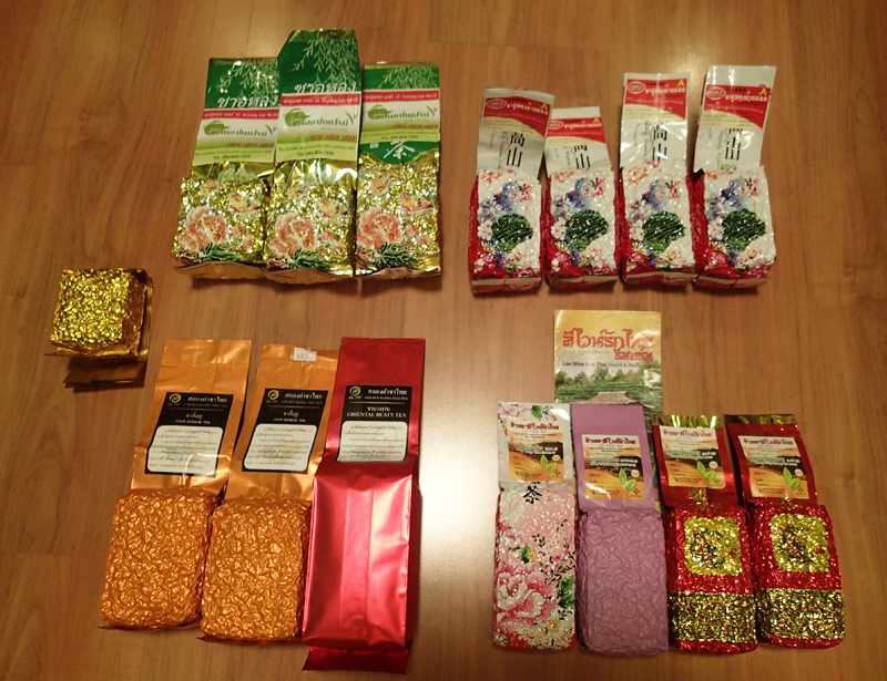 Почти три кило чая. Левая нижняя кучка покупалась в Чианграе, остальное — в Бан Рак Тай, куда мы специально ездили за улунами. Активно его пьем, хороший качественный чай, по сравнению с китайским довольно дешевый (3–10$ за 100 г). Чианграйский чай идет по верхней ценовой категории и мы жалеем, что не купили побольше «Восточной красавицы», она прямо как настоящая. Вполне верим, что его действительно экспортируют в Тайвань.