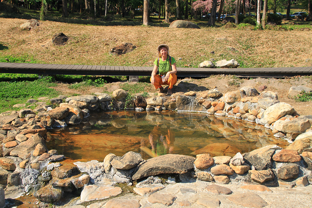 Маленькие теплые бассейны у реки теперь используют только парить ноги. Зато большие теплые пруды, которые пустовали в прошлый раз, нынче для купания. Было воскресенье и довольно много народа, почти все тайцы. Мы выбрали левый большой бассейн, в нем долго можно сидеть, он примерно +36-37 градусов.