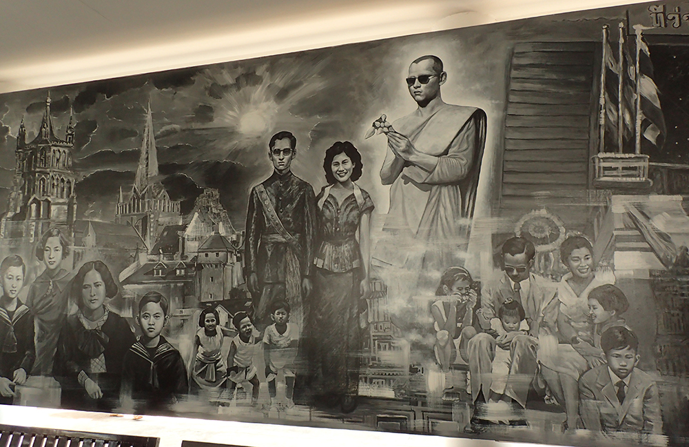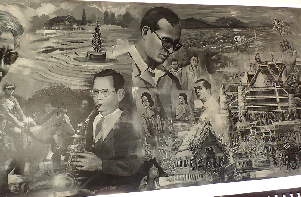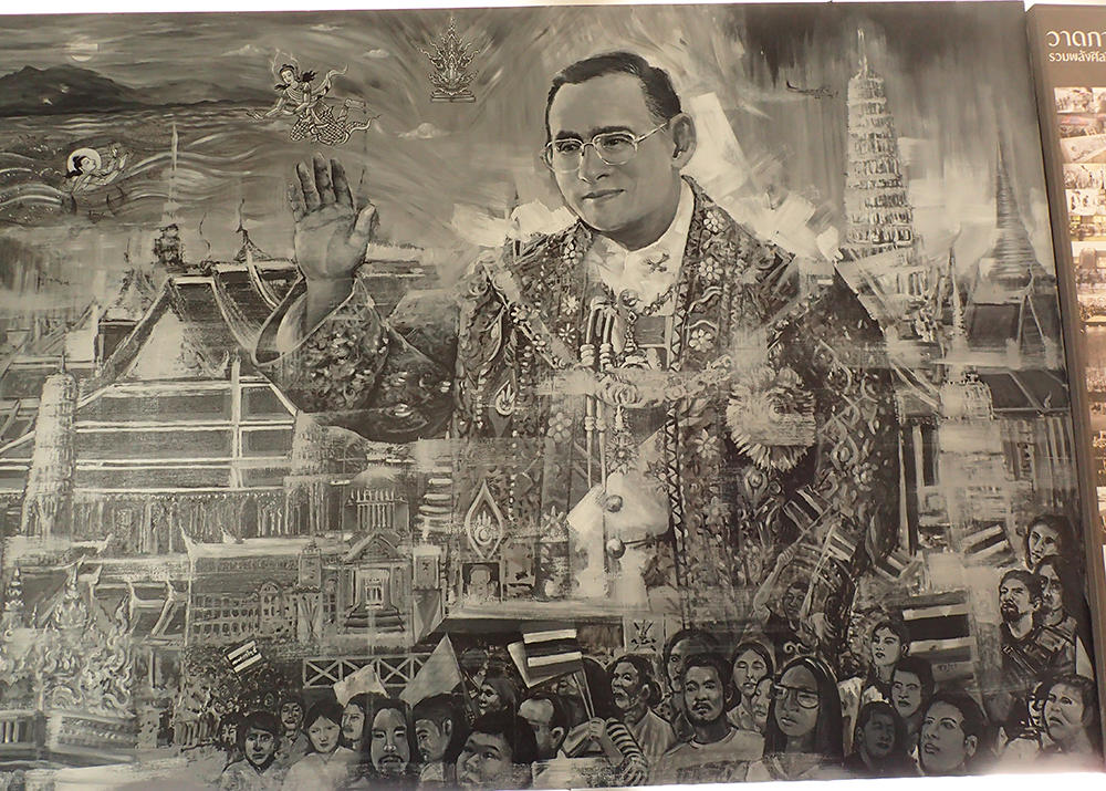 В другом здании во всю стену нарисована картина, посвященная жизни любимого умершего тайского короля Пхумипхона Адульядета (Рамы IX).