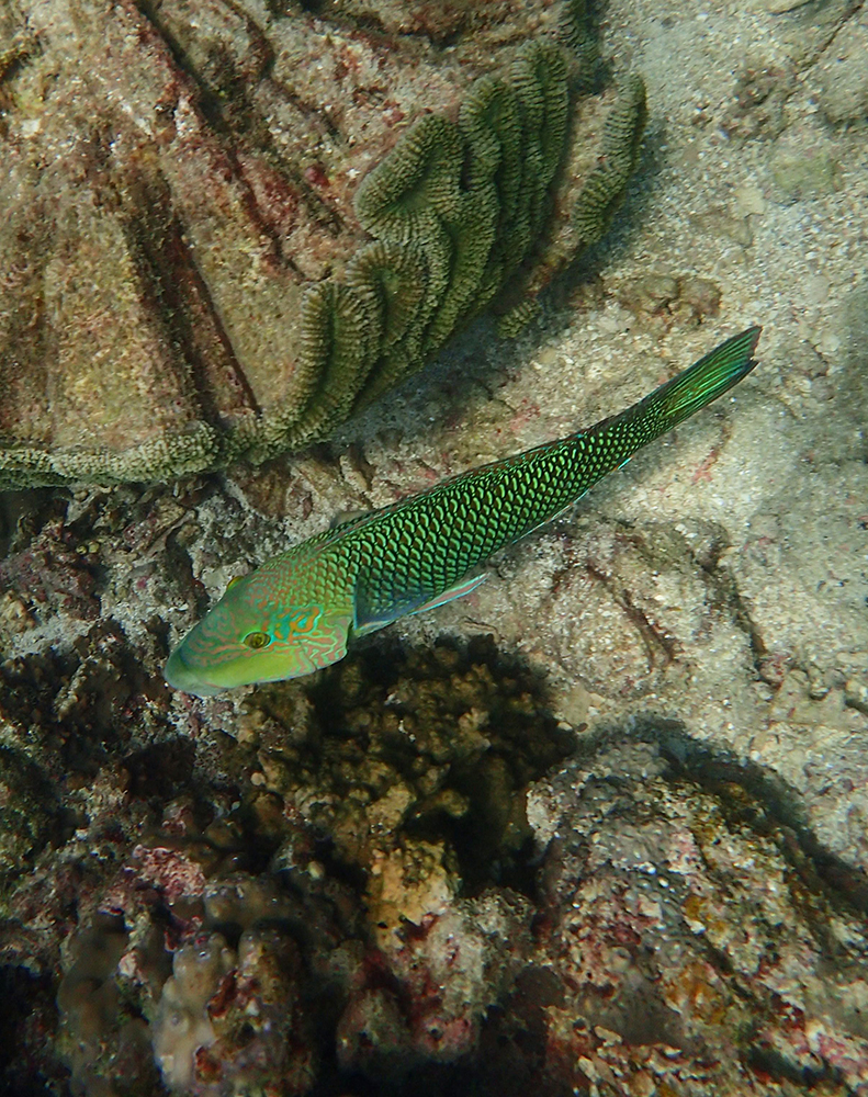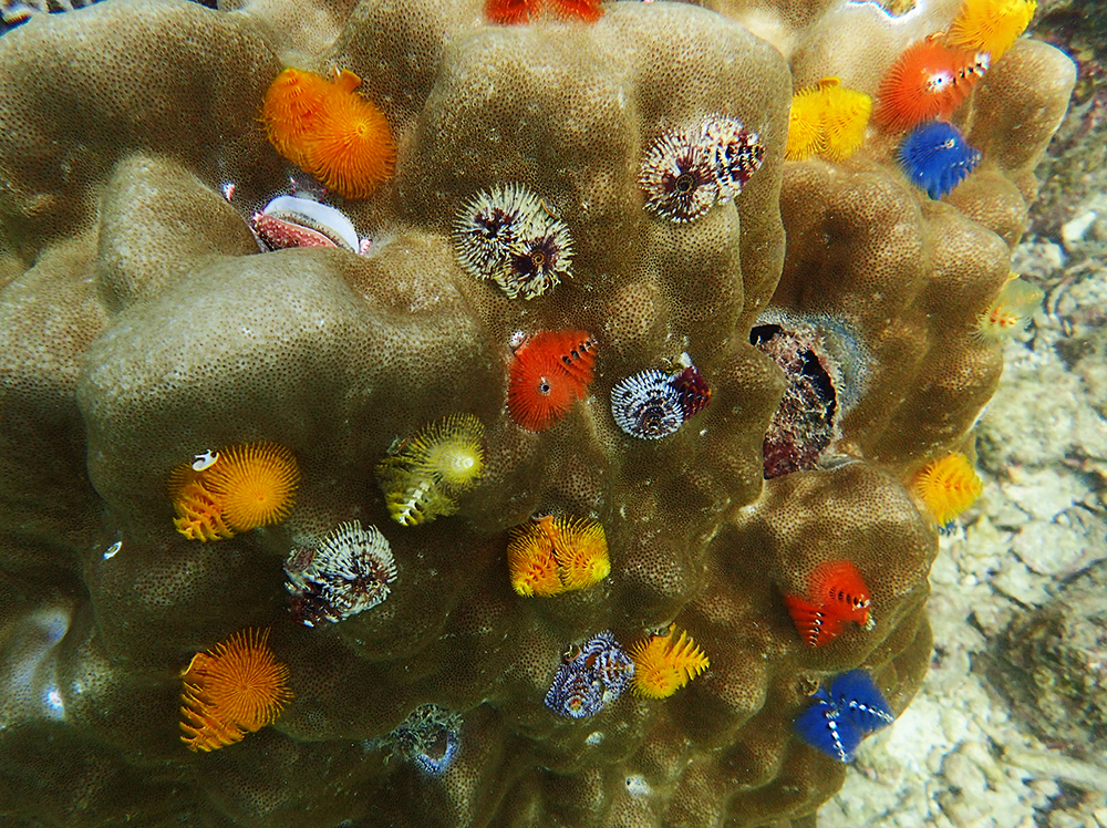 В бухте мы провели около 6 часов в общей сложности, было два больших заныра — первый по левой стороне бухты, второй справа. Кораллы ограничены буйками, чтобы лодки туда не заплывали. Между погружениями ели, отдыхали и убирались.