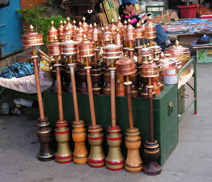 Большие молитвенные барабаны, воткнутые непонятно во что. Крутить такой барабан в руках - уже значительное усилие. В Тибете часто их не инкрустируют и не чеканят на них мантры, только помещают внутрь свиток с молитвой