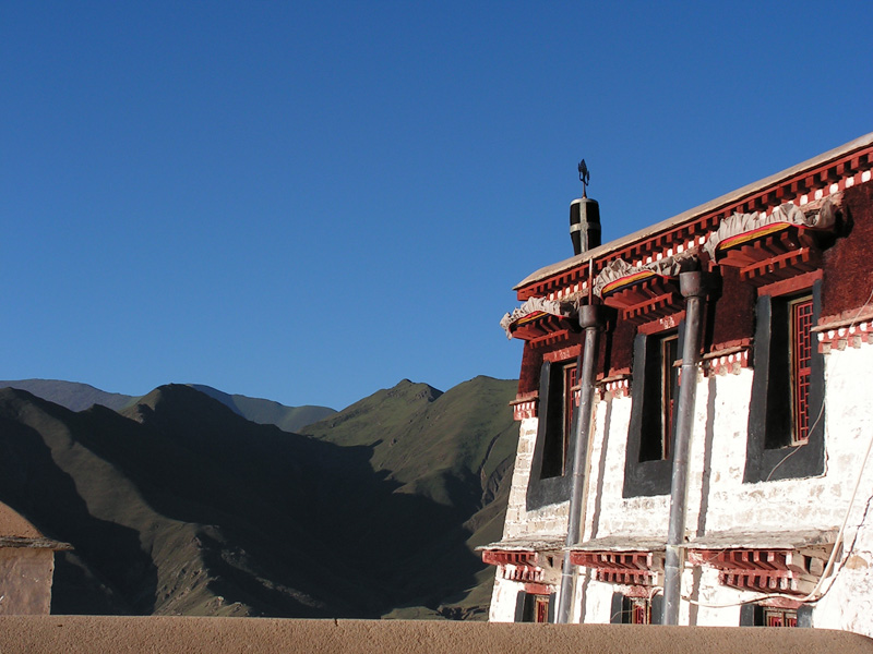 Цвета тибетских строений вообще и храмов в частности имеют символическое значение. Белый - цвет Авалокитешвары, боддхисаттвы сострадания. Красный - цвет Маньджушри, боддхисаттвы мудрости. А черный - цвет Махакалы, защитника учения.