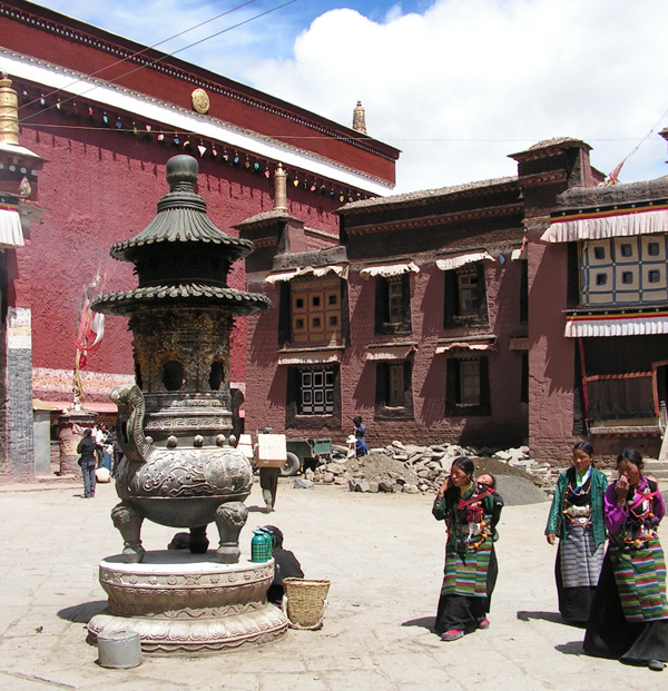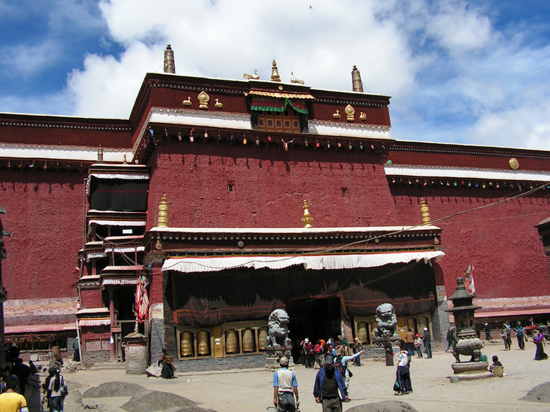 Монастырь Сакья был построен вокруг нескольких деревьев, из которых в 11 веке внезапно начала сочиться кровь. Стволы деревьев стоят внутри главного храма до сих пор. Не знаю, потому ли, но основное здание сделали красным.
