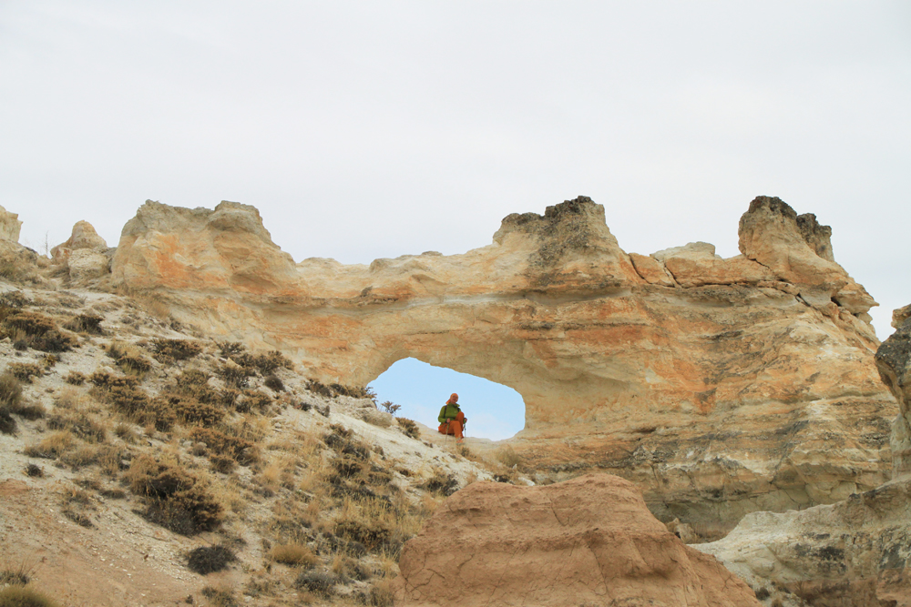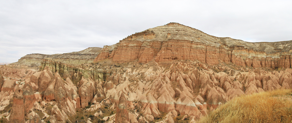Сюда подведен асфальт и привозят экскурсионные автобусы, в основном смотреть на закат. В этот день закат нам не грозил, было пасмурно. Так что мы посмотрели в дырку, за которой был ничем не примечательный горно-степной пейзаж, и пошли в сторону Гёреме вниз по Красной долине.