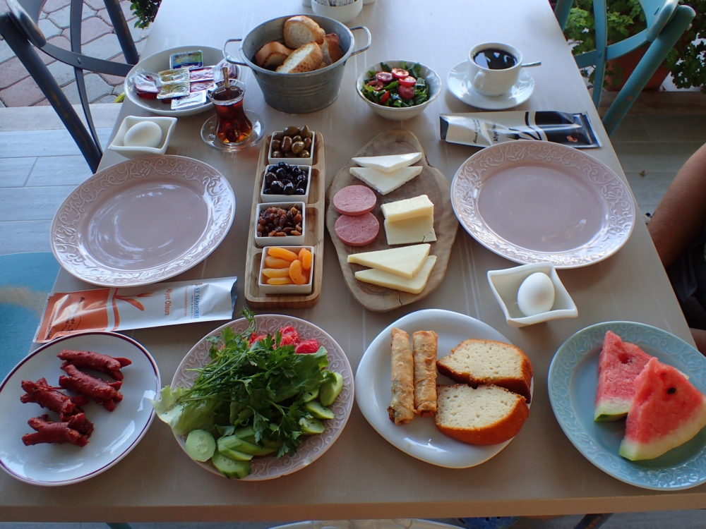 Еще у этого отеля был очень удобный вариант ковидного завтрака. Теперь ведь все шведские столы в Турции запретили, поэтому иногда завтраки организованны неудобно. Но тут ты садишься за стол, а к тебе подкатывают тележку с девятью тарелками.