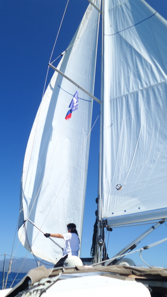 В конце к мотору еще и стаксель поставили, чтобы обогнать пару желающих придти раньше нас в марину. День сдачи яхт, возможные очереди на заправку, мы решили поднажать. А в случае попутного ветра парус дает лишний узел к крейсерской скорости на моторе. И вот так получилось, что парус был натянут не очень сильно и багор стал не нужен, можно было держать парус рукой.