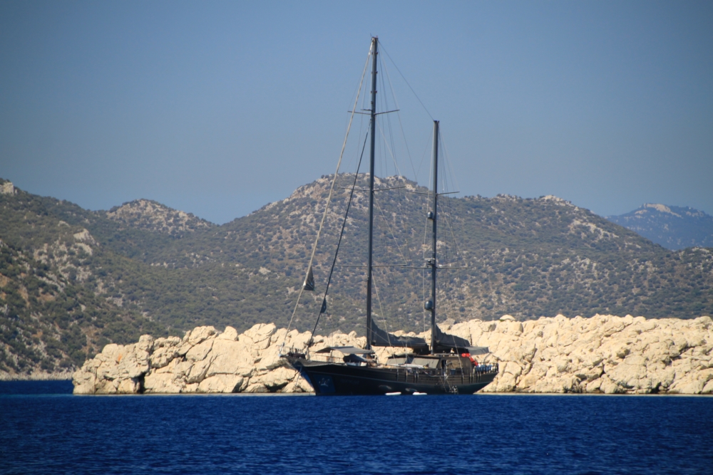 Пять часов шли под парусом бакштагом, потому что фордевинд получался уж очень шатким. Приходилось идти галсами, волны и ветер до 20 узлов, хотя чаще 15–17. За пару часов перед Фетхие ветер немного стих, и я даже обед приготовила. Под конец пошли на моторе, просто устали. А паруса не убирали, получалось быстрее на 0.5–1 узел. В этот день яхта разгонялась до 6.5, максимум — 6.9 узлов. Наверное, 7 узлов — ее конструктивный максимум.