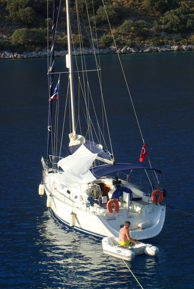 Возле острова Гемилер стоит много яхт, постановка на якорь под боковым ветром там была непростой. Да еще, не успели мы встать, нас стал кошмарить океанис «Исилдур» с неопытными русскими на борту: они долго, опасно и неправильно вставали рядом. Сперва надо зафиксировать якорь, а потом растягивать конец. Если делать это одновременно, то якорь может не схватиться, и у них так было раза три, а то и все четыре.