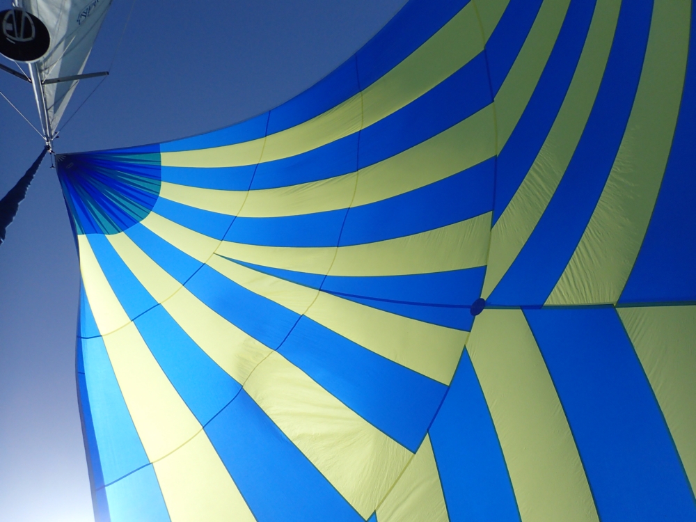 Меж тем наступило лето, днем было жарко. До обеда мы разбирали паруса и концы. У нас помимо большого стакселя есть еще два паруса — генакер и код зеро — оба огромные и тонкие, каждый в своей сумке. Померили бухты верёвок, поменяли шкоты на стакселе, перевернув их! Потому что уж очень истрепанные были. И другие веревки пухлые от времени и разваливаются, так что сложно закрыть и открыть стопора.