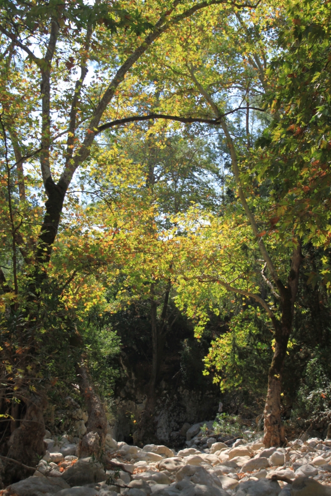 В реке наверху есть вода, а в месте перехода ее нет. Русло реки и чинары: