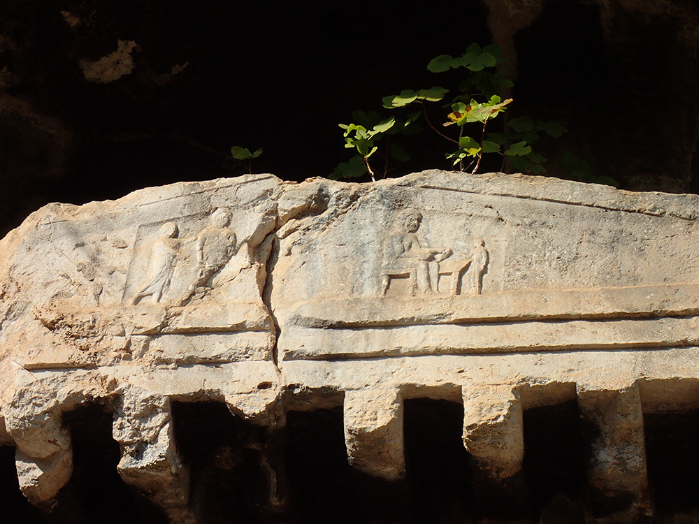 Интересно, что вокруг них есть проход, и только каким-то фрагментом стены гробница все-таки соприкасается с основным скальным массивом. Тут видно, как каменотесы изображали балки под крышей.