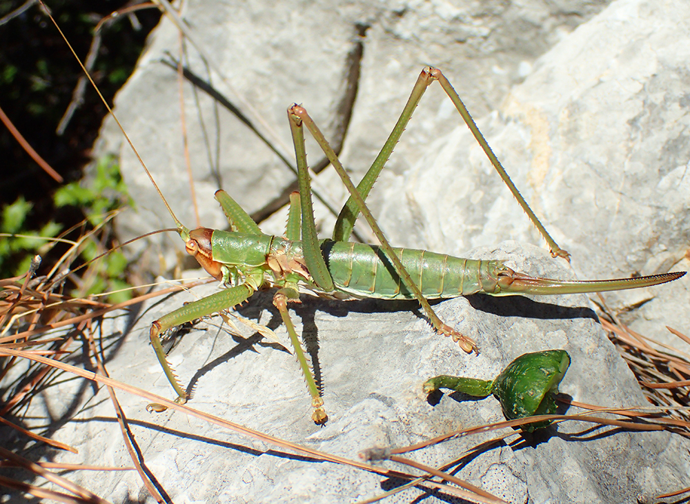 На перевале мы устроили обед и решили дальше не ходить: дальше путь шел вниз, а нам еще возвращаться. Пообедали и покормили огурцом гигантского кузнечика.