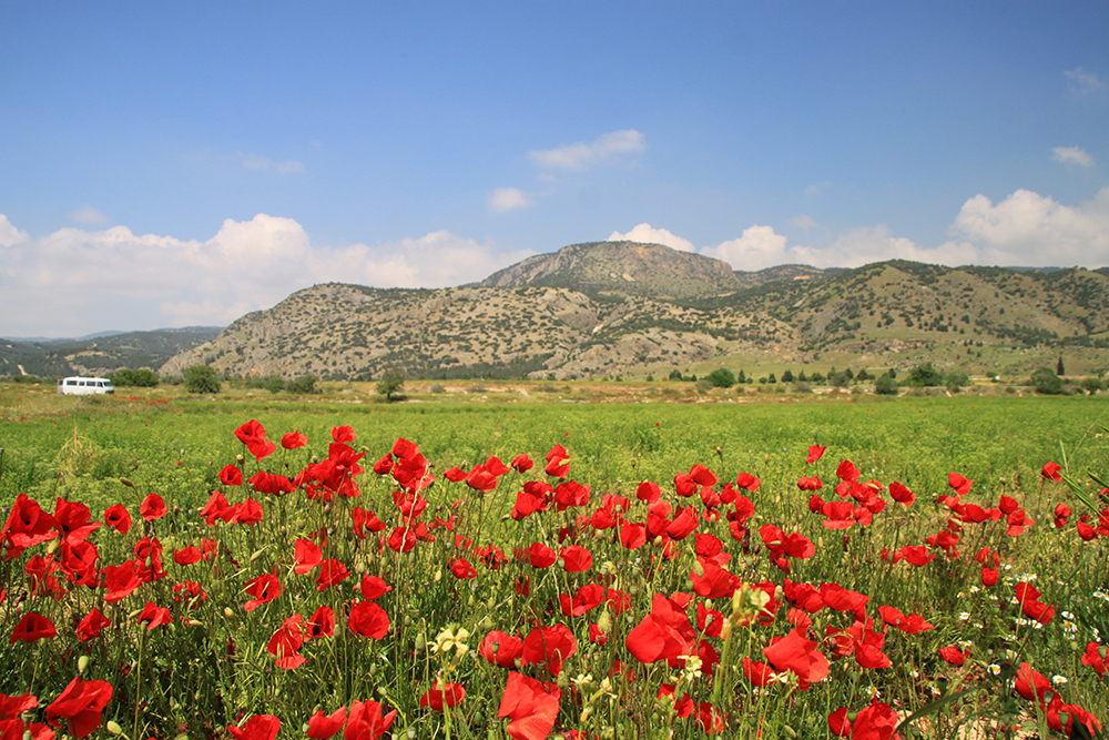 На арендованной машине ехать от Анталии до Памуккале чуть больше 3 часов, с отдыхом почти 4. В нагорье весна, цветут вишни, груши и тополя распускаются. А в нашей теплице уже ближе к +30 и фрукты с ягодами на деревьях висят.