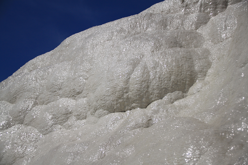 Воду теперь пускают в основном в бассейны и вдоль бассейнов рядом с пешеходной тропой. Другие террасы все стояли сухие, и явно давно. Зато снизу за зиму травертин стал толстым и белоснежным.