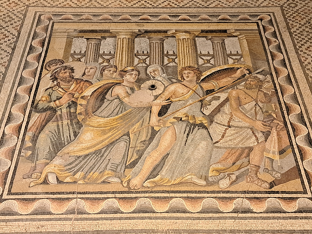 Сюжеты мозаик тематические и это полотно тоже, скорее всего, было на дне бассейна. Какое же хорошее качество мозаики и клеящего вещества должно было быть, чтобы мозаика дошла в целости!