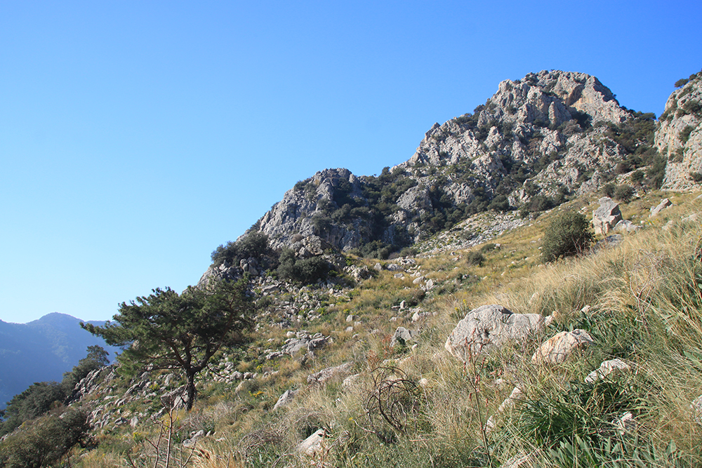 Карта мрачно обещала полное отсутствие пешеходных троп. Ну, это не совсем так: какие-то призрачно натоптанные тропки в начале и под перевалом все-таки были. Но в целом приходится прыгать по камням и выбирать путь между колючих кустов.