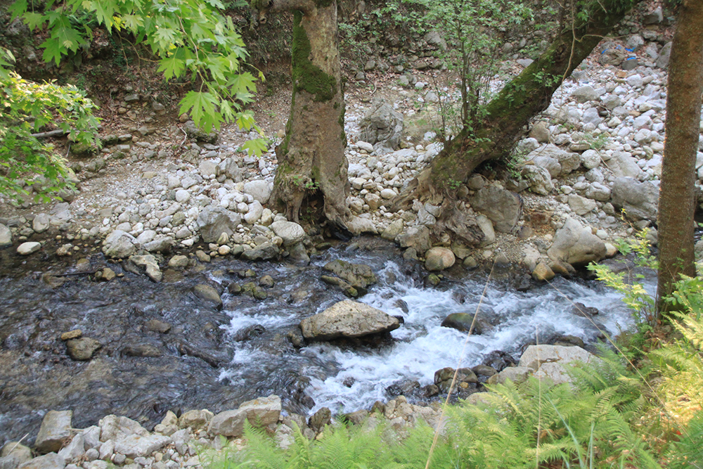 Русло все зеленое, очень красивые старые чинары и утренний солнечный свет в листьях.