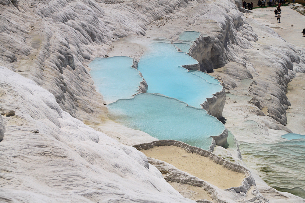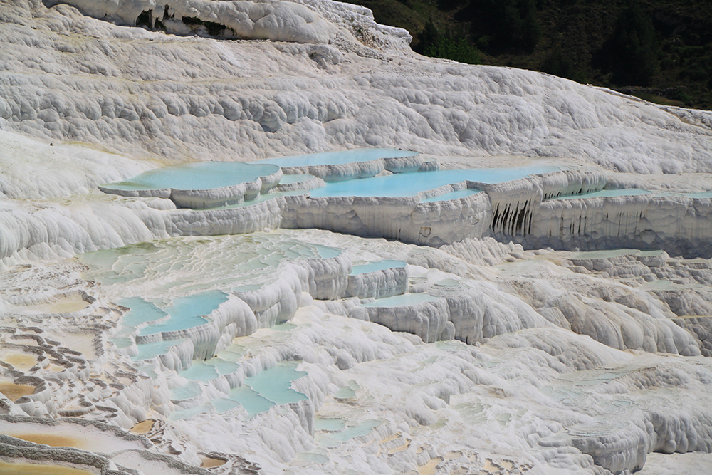 Мы очень удачно втиснулись в погодные рамки: в субботу был 8-балльный шторм, в понедельник было пасмурно, а в воскресенье очень удачно светило солнце, причем прогноз погоды был весьма точен и за 5 дней не изменился. В пасмурную погоду на травертиновых террасах совсем не такие красивые виды, нужно солнце.