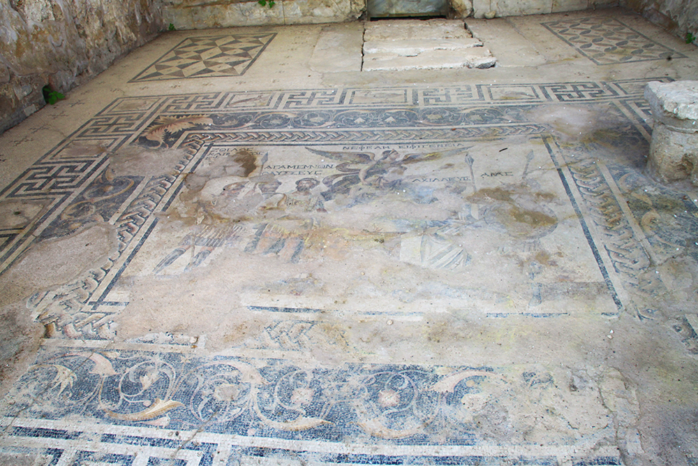 Изображает Агамемнона, Ахилла и прочих древних разбойников. Прямо так и хотелось влезть внутрь и протереть мозаику влажной тряпочкой, потому как она пыльная и плохо видно. Но я не стала. Следы мозаики и снаружи на улице попадаются.