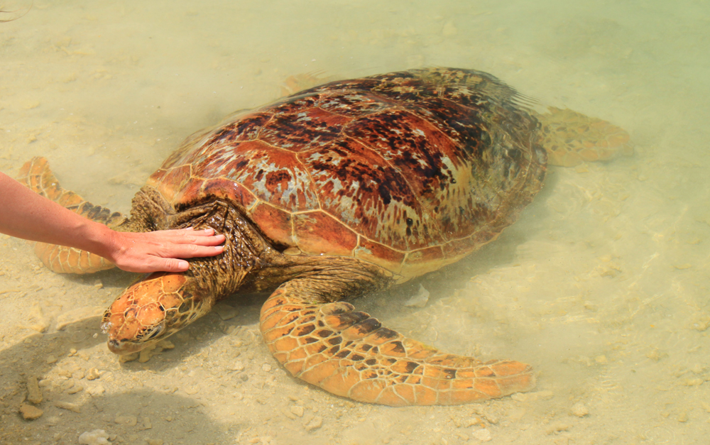 Черепаху можно гладить, войдя в бассейн, а еще кормить папайей. Только руки надо беречь, потому что она с виду такая безобидная, но хватает еду будь здоров :-)