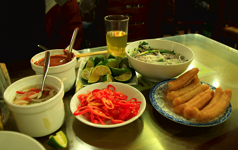 Отличный завтрак, а также обед или ужин. Рисовая лапша очень нежная и не надоедает, бульон нежирный, но при этом со своим особым характером, мясо тонкими ломтиками (обычно говядина). В качестве добавки — разнообразная свежая зелень и кусочек лайма. Перец и острые пасты я не добавляла. Литровая миска фо стоит в среднем 1.5$