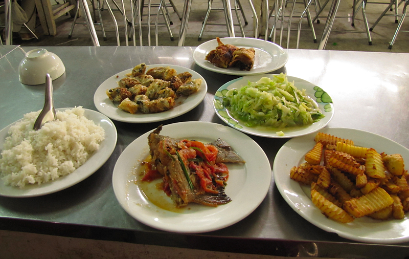 Наш не очень скромный обед, включенный в стоимость экскурсии. Из животной пищи имеются рыба и утка — все то, что живет и растет в местной речке.