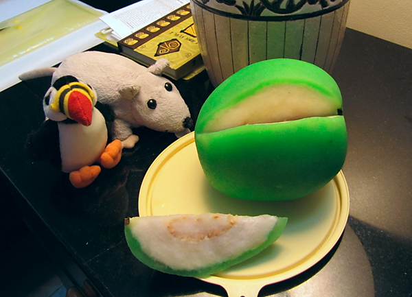 Купили на базаре новый фрукт по имени гуава. Странная она какая-то, не похожа на индийскую: огромная и явно со снятой кожурой, кислотного цвета.