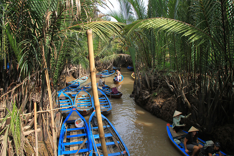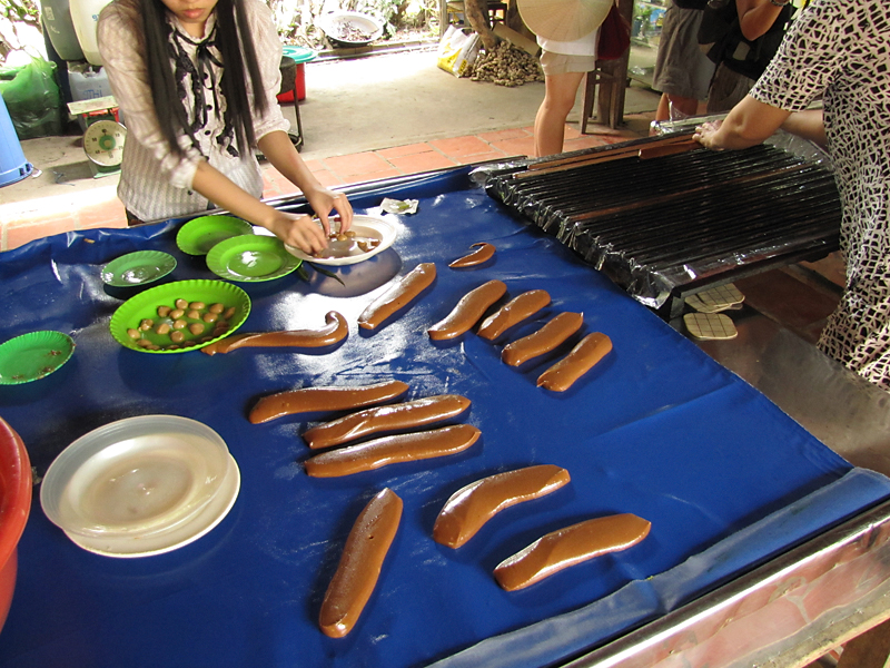 Первый день был посвящен осмотру окрестностей Мито (My Tho) и Бен Че (Ben Tre), ничего более подробного сообщить мы не можем. Дельта Меконга состоит из множества рукавов, соединенных протоками. На островках живут люди, выращивают что-нибудь вкусное, или содержат мини-фабрики по производству всякой еды. Как туда можно попасть самостоятельно — понятия не имею: наверное, жить в маленьком городке неподалеку, нанимать лодку и надеяться, что лодочник привезет примерно туда же, куда нас привез экскурсионный катер. :-)