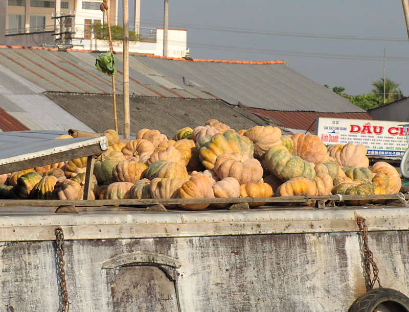 Что приятно — на рынке продают фрукты и овощи, а не китайский ширпотреб. Продавцы торгуют с больших лодок, покупатели приезжают на маленьких лодках за товаром.