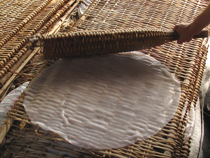 Процесс выглядит следующим образом. Смесь рисовой муки, воды и тапиоки пекут на пару в виде блинов.