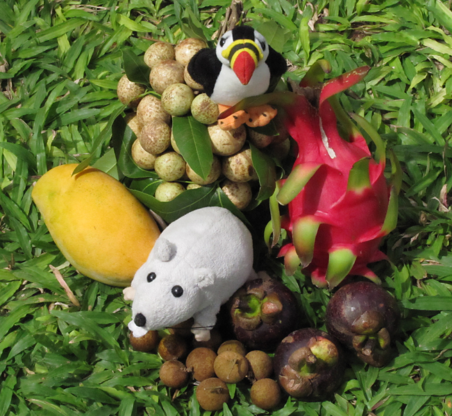 На следующей фотографии мангостины слева, а неведомая зеленая фигня вторая справа сверху.